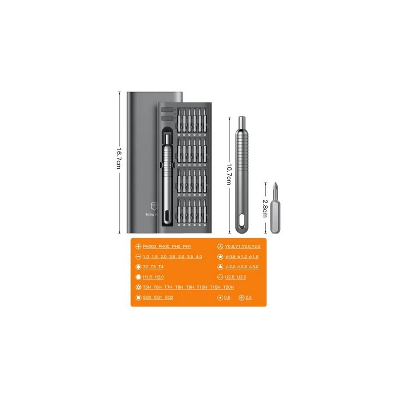 Zestaw wkrętaków precyzyjnych, w tym rękojeść, 24 bity i etui. Wykonany ze wzmocnionego stopu zapewniającego wysoką sztywność. Doskonały chwyt dzięki przemyślanemu kształtowi. Przesuwny mechanizm otwierania etui.